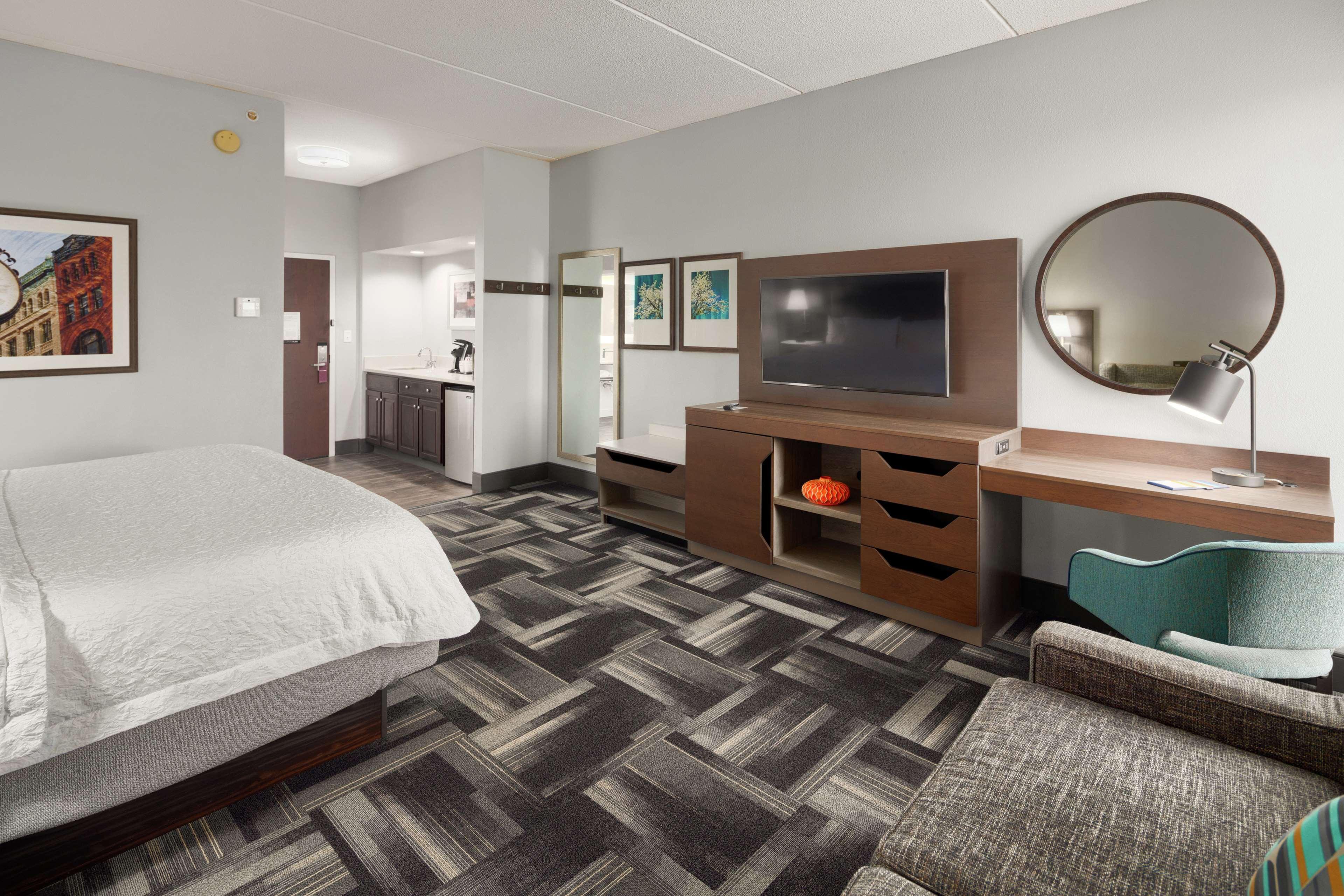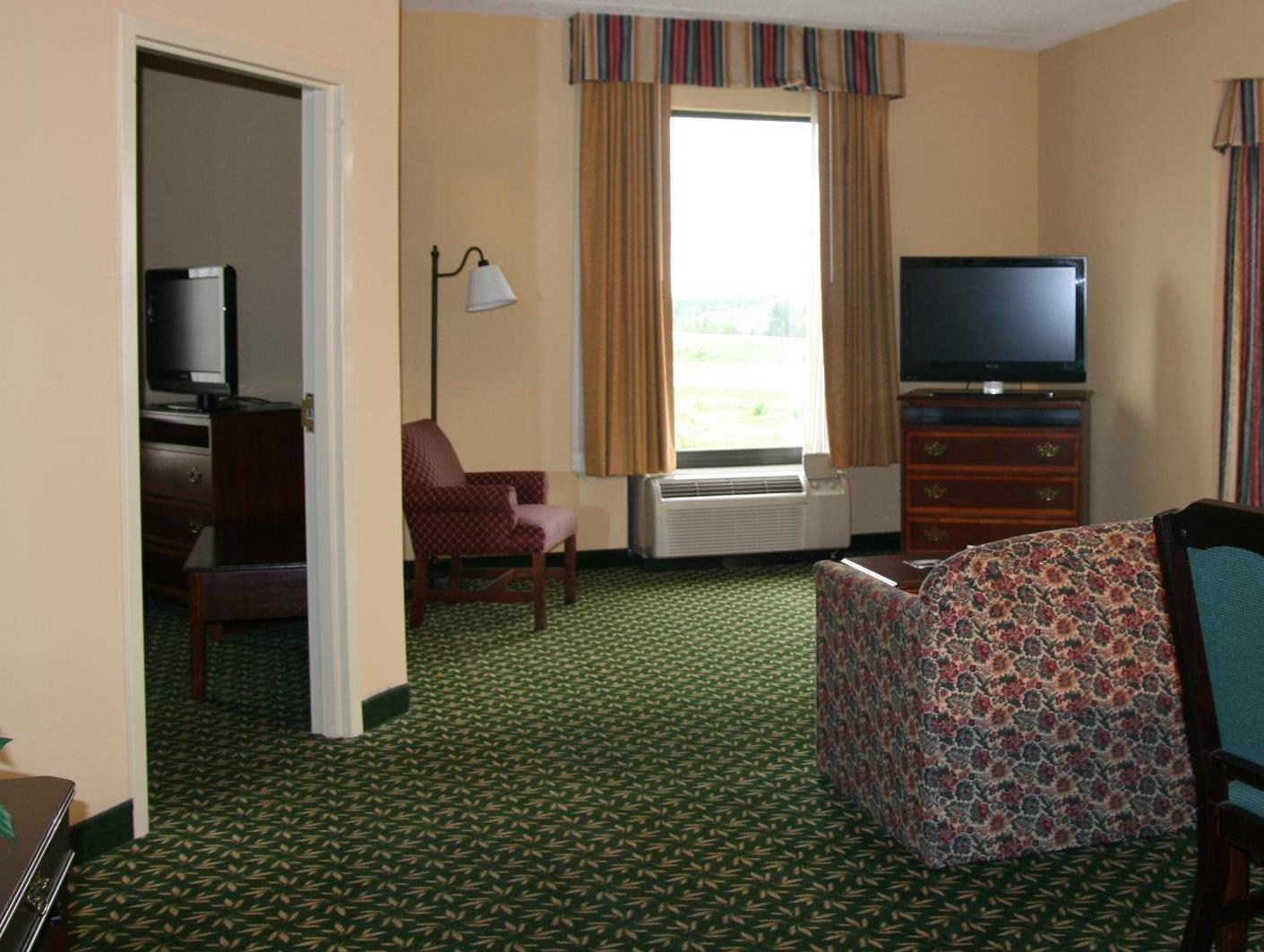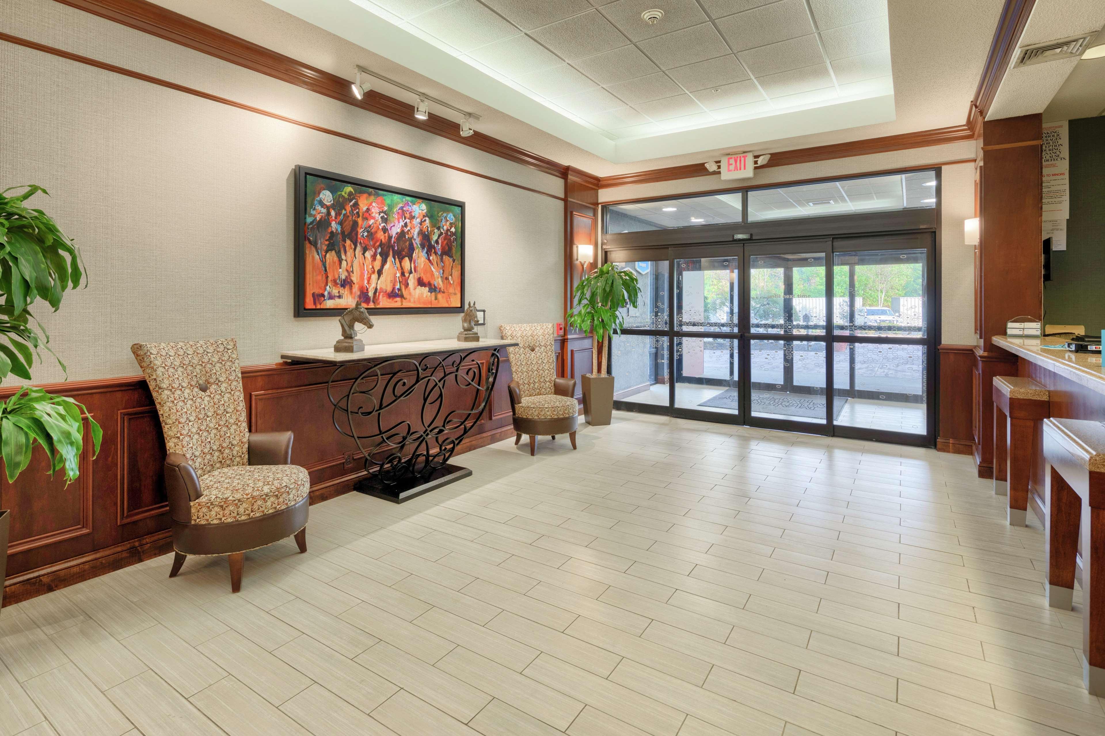The Hampton Inn Louisville-Northeast hotel is located off Kentucky Interstate 265 (Exit 32) at Westport Rd. The hotel design features a traditional Georgian style and opens to a well-lit interior corridor. A variety of restaurants, shopping, and movie theatres are located within one mile of our hotel, in Louisville, Kentucky. Amenities of the Hampton Inn Louisville-Northeast hotel include our complimentary hot breakfast, running track, outdoor pool, exercise room, business center, fishing pond, and wireless internet access, available in the lobby. Each room of our hotel features a hair dryer, night light, coffeemaker, iron, ironing board, full length mirror, two-line phone with a data port, high-speed internet access, clock radio, electronic locks and 27'' remote-controlled cable TV with HBO. Connecting rooms, cribs, and refrigerators, laundry/valet services, a guest laundromat, meeting/banquet facilities and audio visual equipment are also available. We love having you here in Kentucky at the Hampton Inn Louisville-Northeast!